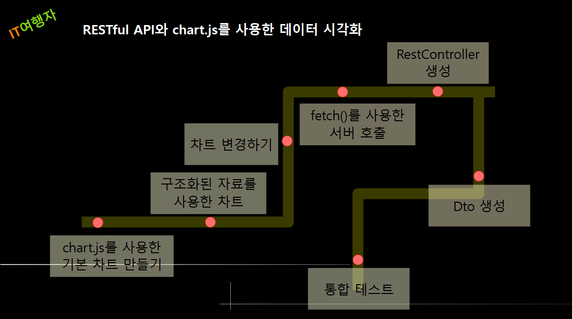 이번에 여행할 목적지는 스프링부트에서 RESTful API와 chart.js를 사용한 데이터 시각화 코스를 여행해 볼까 합니다. 기본적으로 스프링 부트에 대한 개념이 필요한 여행 코스이기는 하지만 관련 동영상과 본 문서를 참고하시면 그리 어렵지 않게 여행해 볼 수 있는 코스라 생각됩니다.